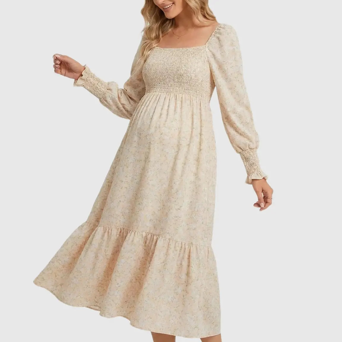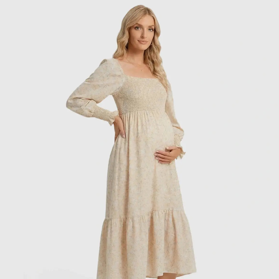 This Shirred Bodice Boho Maternity Midi Dress blends effortless style with a soft, flexible fit that moves with your changing body. The stretchy smocked bodice gently adapts as your bump grows, while the airy skirt and long sleeves keep you feeling light, feminine, and confident. Designed for everyday comfort and easy dressing, it’s the perfect throw-on piece for pre-pregnancy through every trimester.