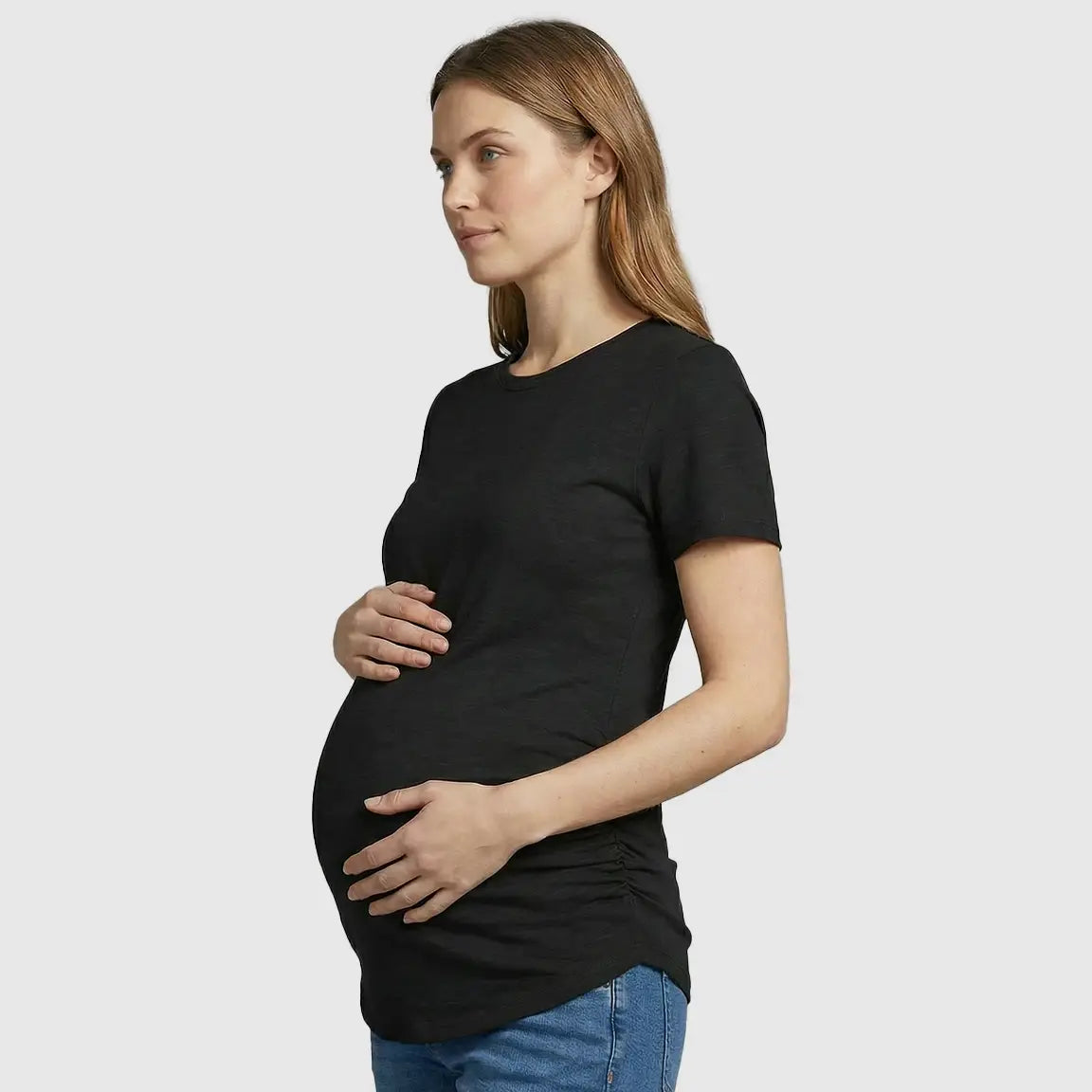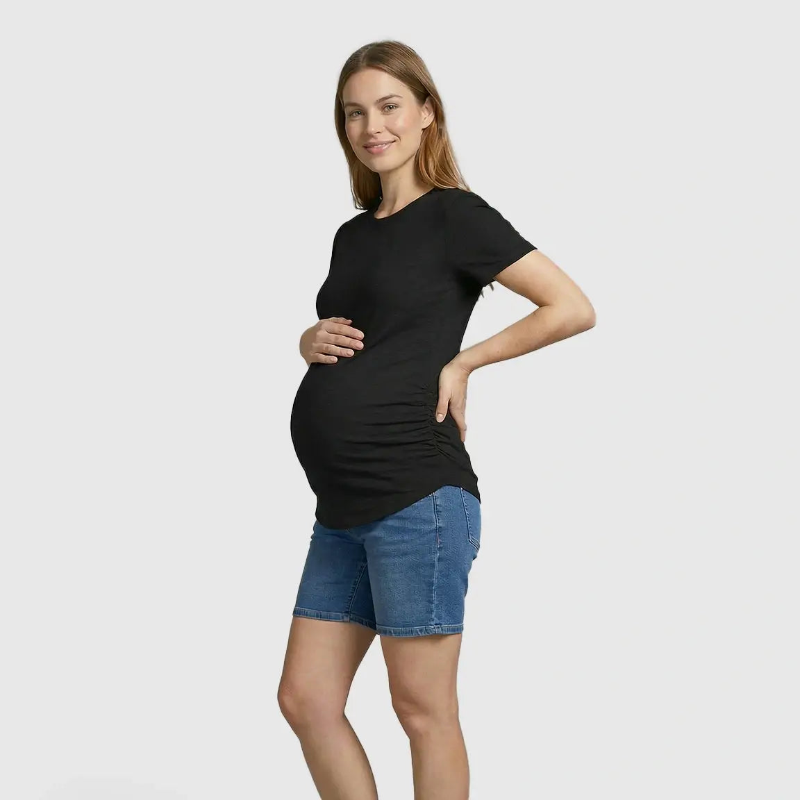 This everyday maternity t-shirt features soft stretch fabric and flattering side ruching that grows with you through every trimester. The fitted silhouette highlights your natural shape while offering a smooth, comfortable feel you’ll want to live in. Designed with a classic round neckline and curved hem, it pairs effortlessly with jeans, leggings, or anything you already own, making it your must-have maternity basic for daily wear.