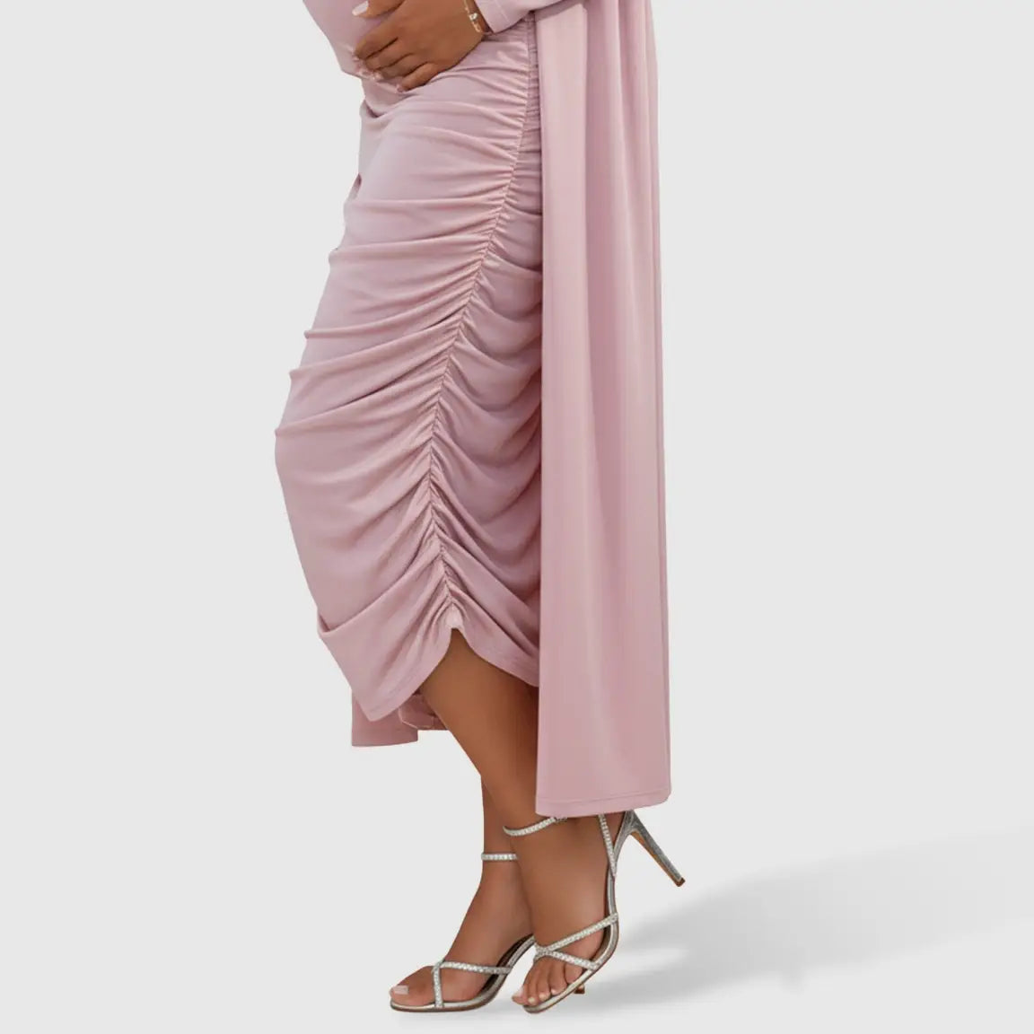 This two-piece outfit features a side-ruched, spaghetti-strap slip dress paired with a soft, draped long-sleeve cardigan for a beautifully layered look. The stretchy, bump-flattering fit molds comfortably to your growing belly while keeping you polished for baby showers, photoshoots, dinners, and daily moments. Designed exclusively for maternity wear to support you through every trimester with ease, comfort, and confidence.