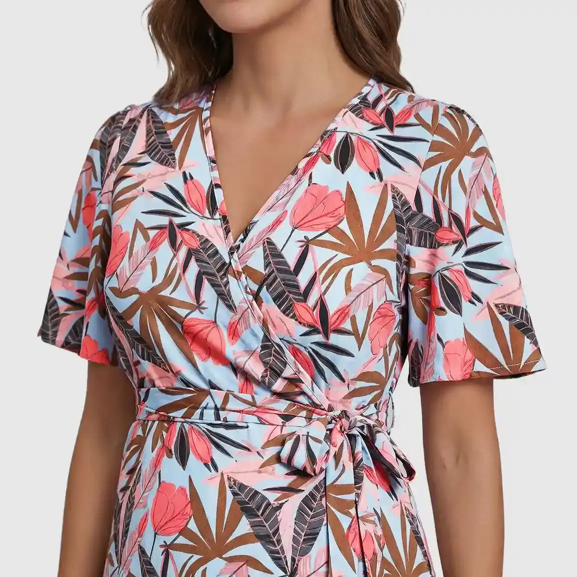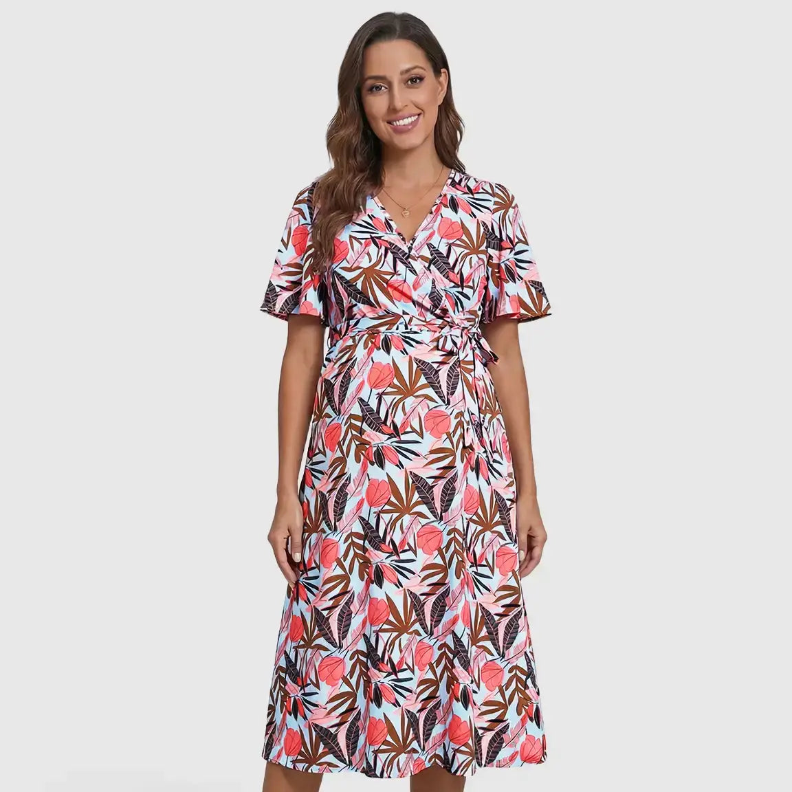 Side Tie Wrap Tropical Pattern Maternity Midi Dress