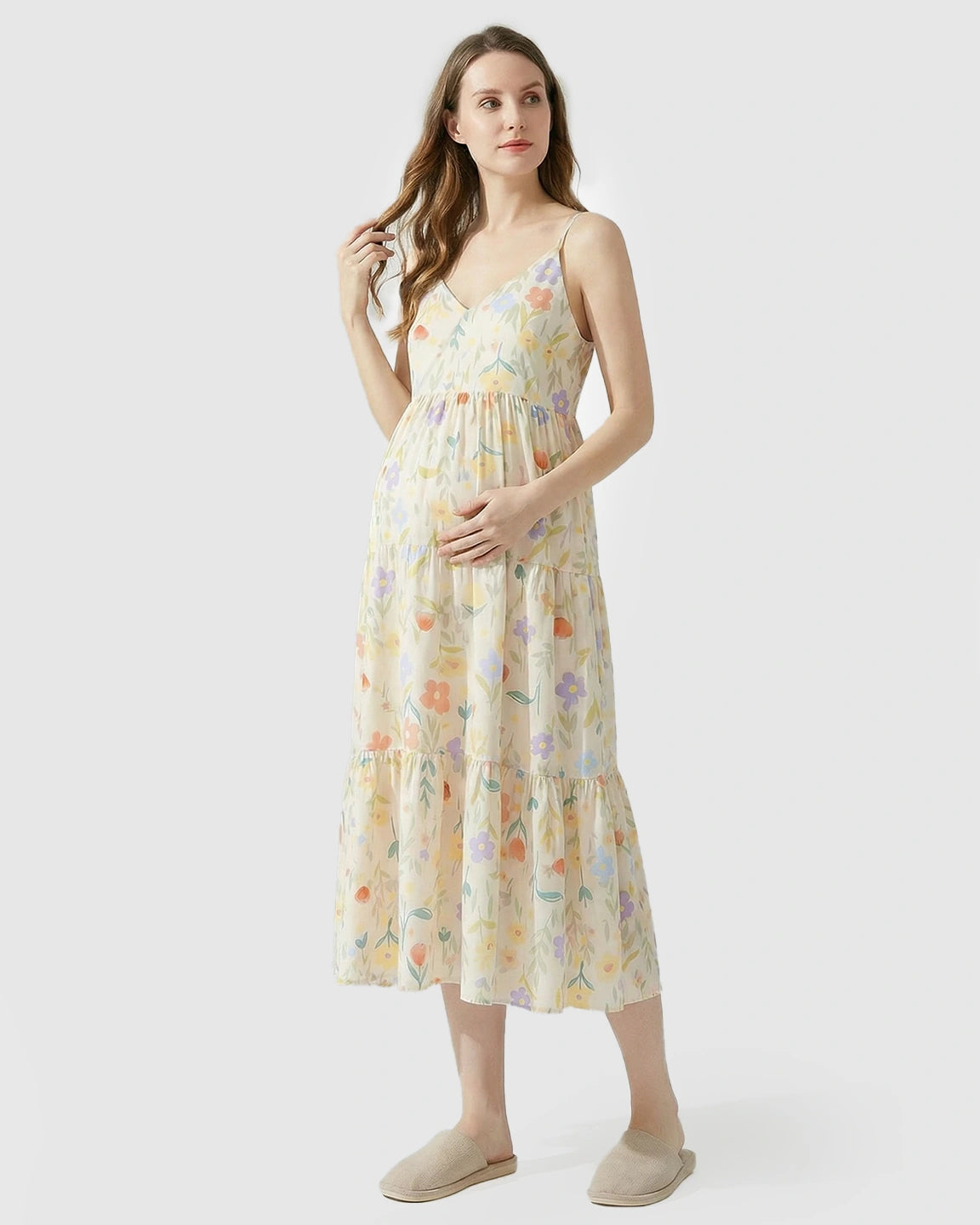 The Sleeveless Colorful Flowers Print Maternity Nightdress feels like a gentle sigh of relief the moment you put it on.
