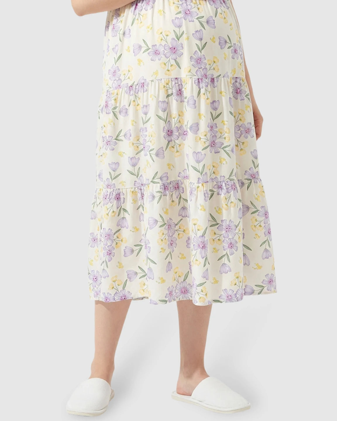 Delicate straps and a tiered ruffle midi skirt create an easy, feminine silhouette perfect for restful nights and slow postpartum moments.