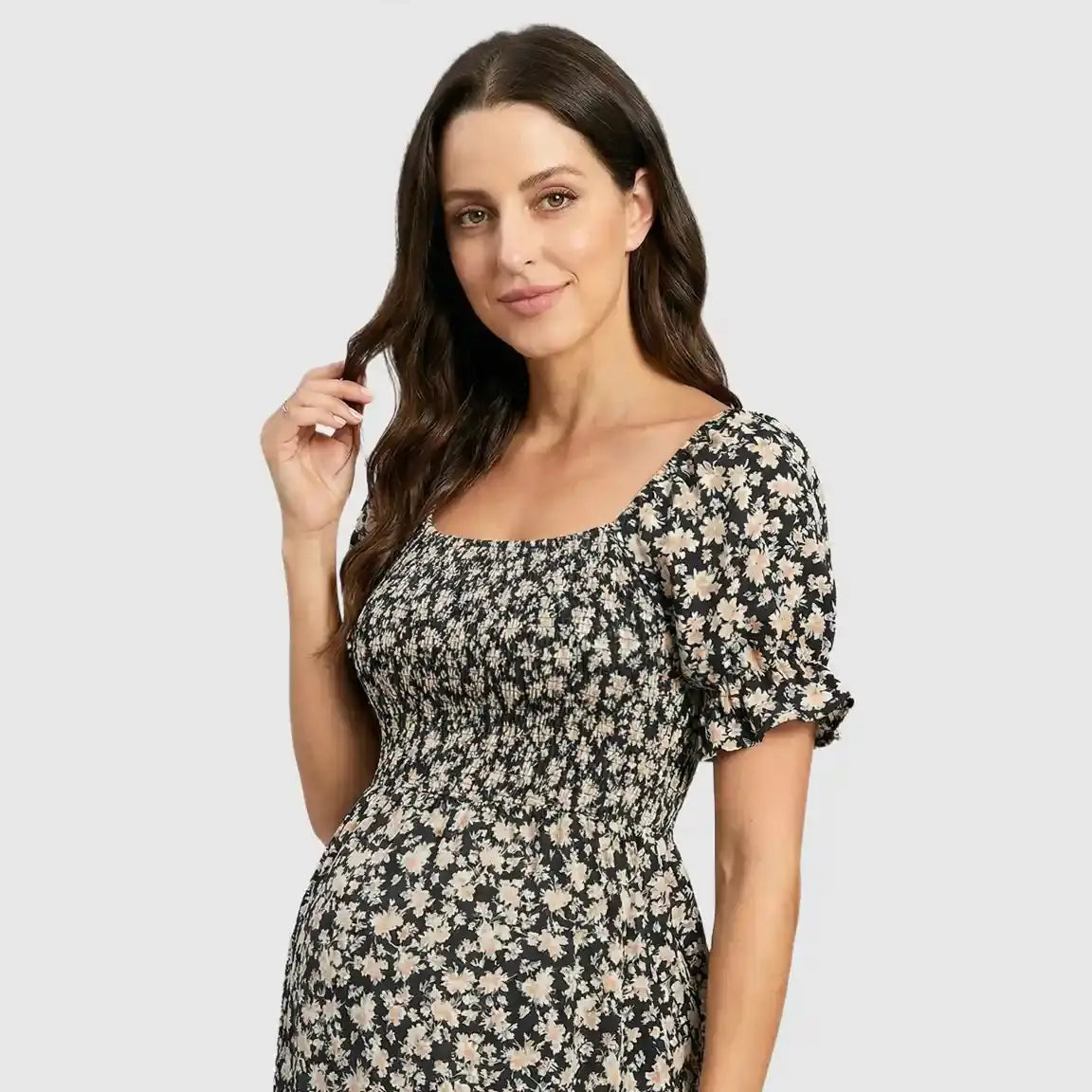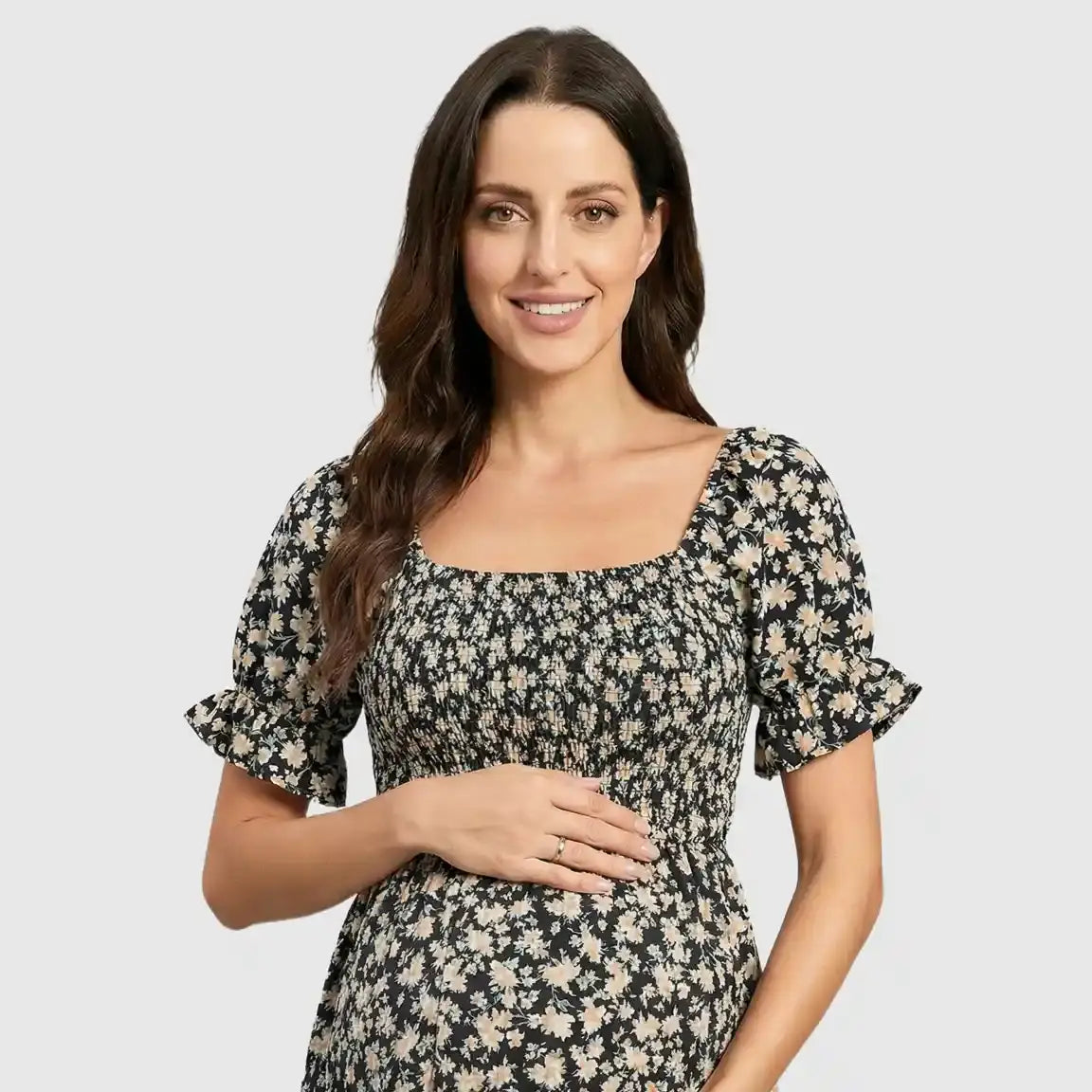 Smocked Bodice Boho Casual Maternity Midi Dress