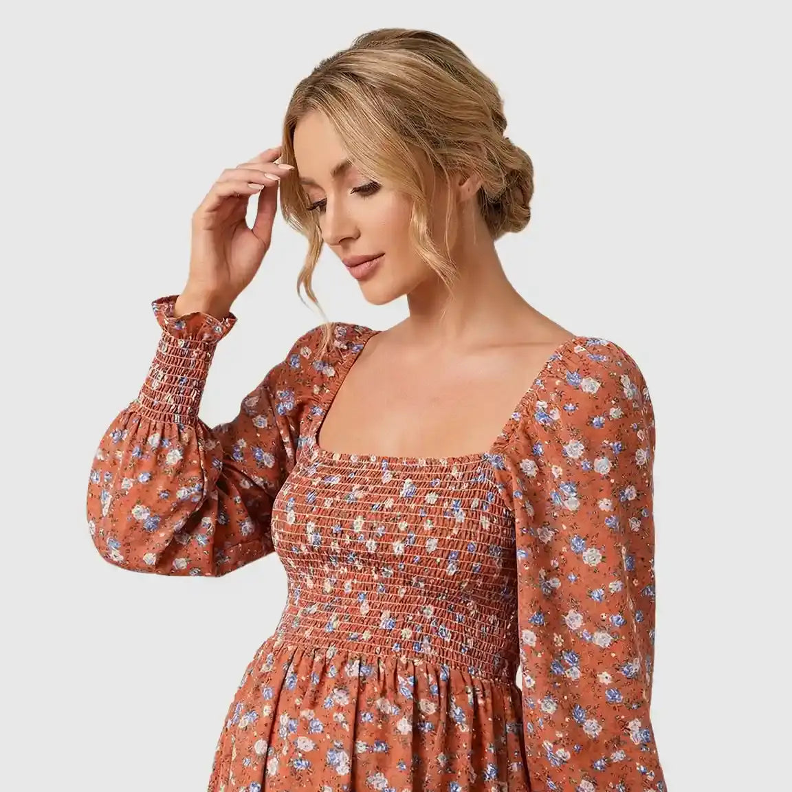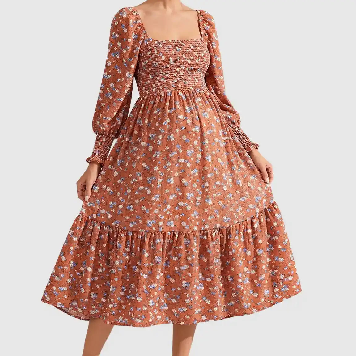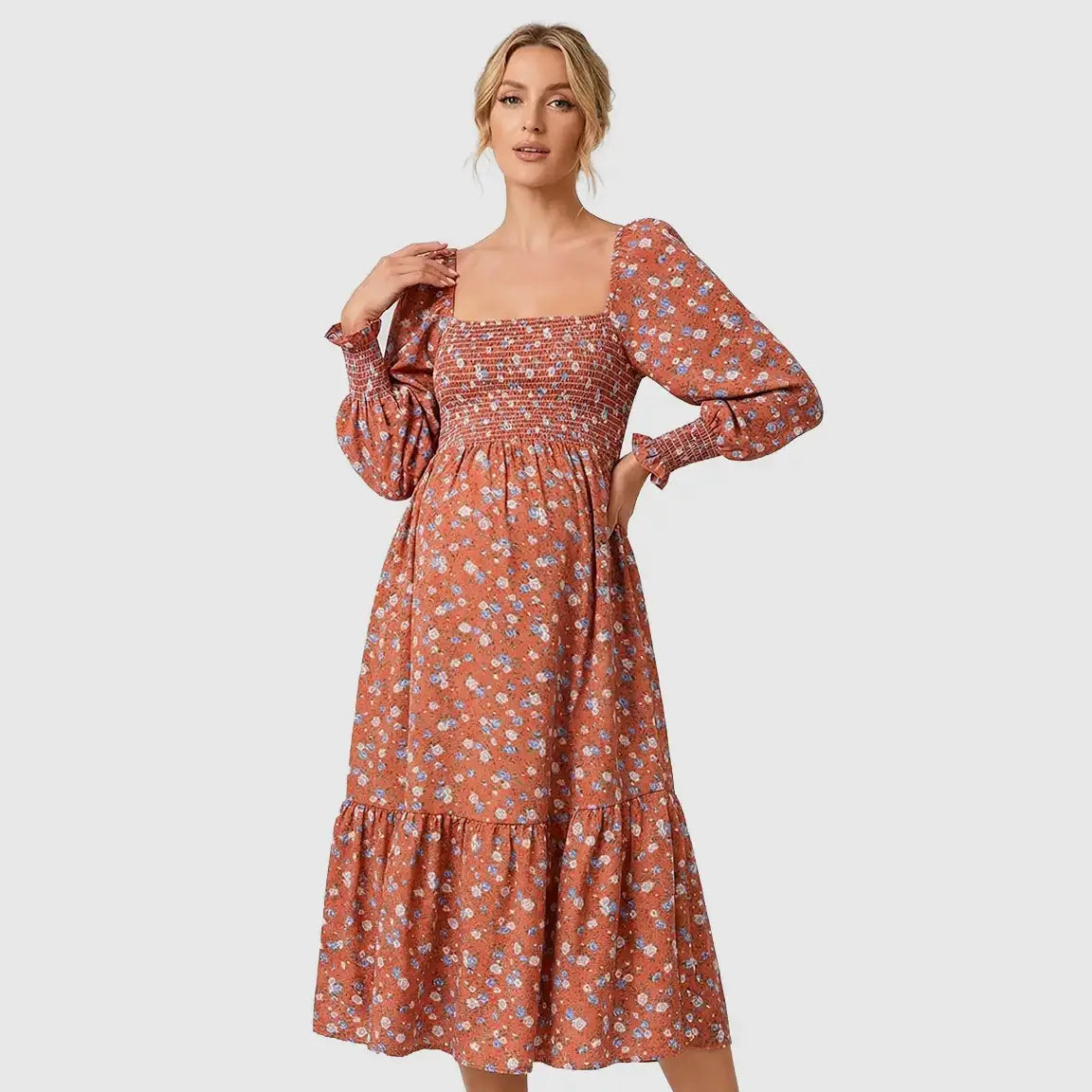 This Smocked Bodice Boho Maternity Midi Dress blends effortless style with a soft, flexible fit that moves with your changing body. The stretchy smocked bodice gently adapts as your bump grows, while the airy skirt and long sleeves keep you feeling light, feminine, and confident. Designed for everyday comfort and easy dressing, it’s the perfect throw-on piece for pre-pregnancy through every trimester.