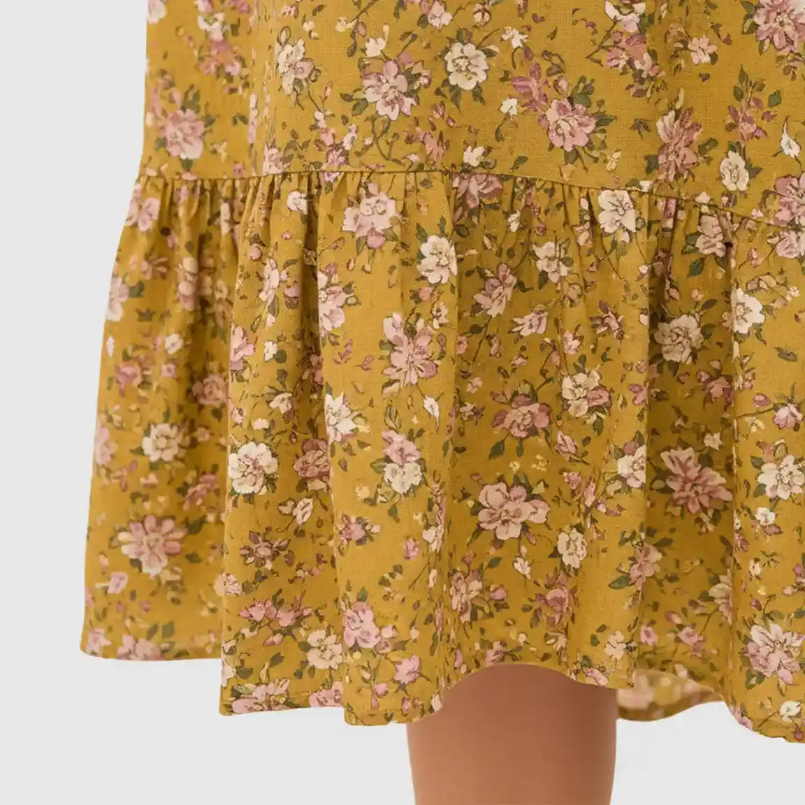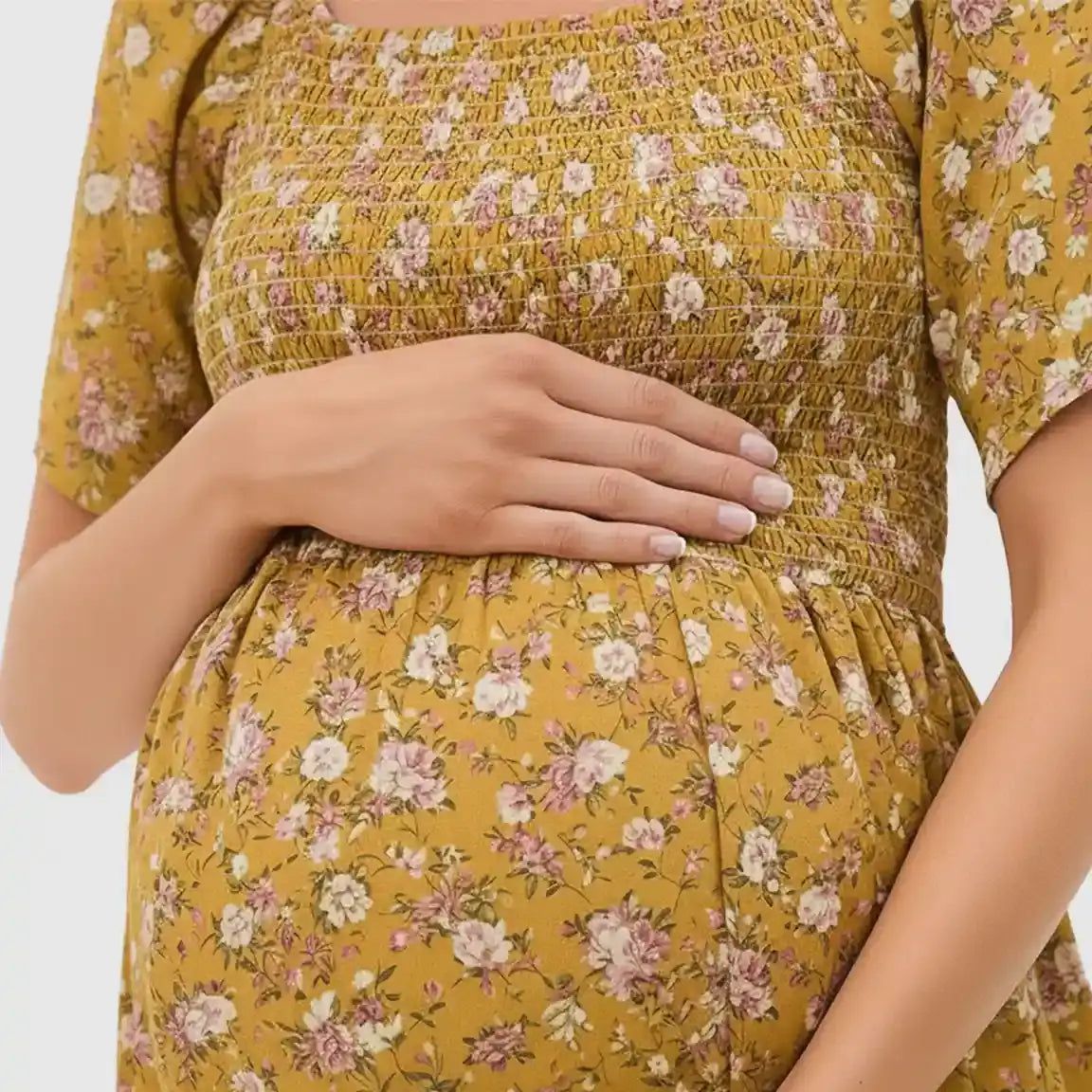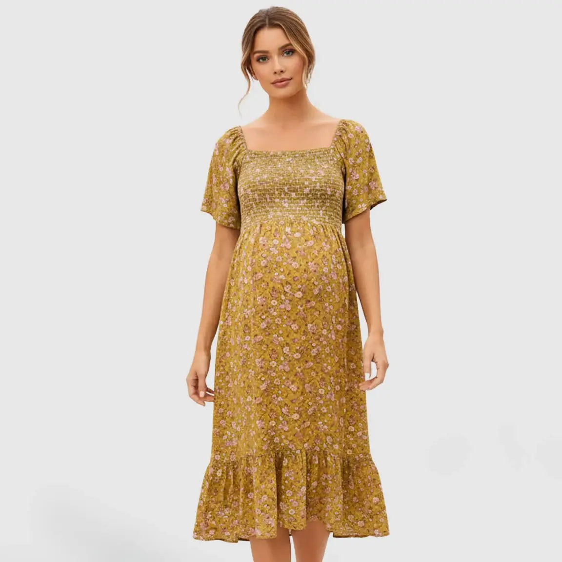 Designed with a square neckline and short sleeves, it offers a soft, feminine look that sits naturally on the shoulders. The stretchy smocked bodice provides a flexible fit that adapts to your growing bump, while the flowy, ruffled midi skirt adds movement and comfort for everyday wear or special moments.