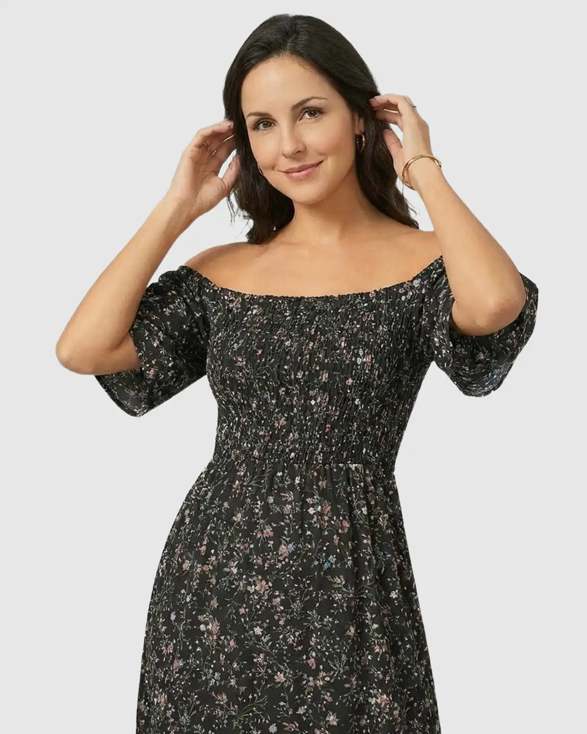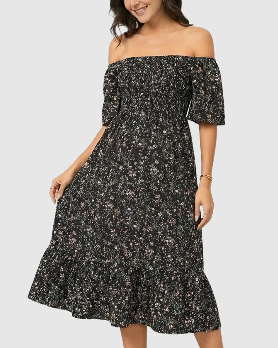 The flowy skirt, Ruffle Hem Dress finish, and dark floral print create that effortless Bohemian Maternity vibe — perfect for brunch, photoshoots, or everyday summer wear. A true Floral Off Shoulder Midi staple that makes getting dressed feel beautifully simple.