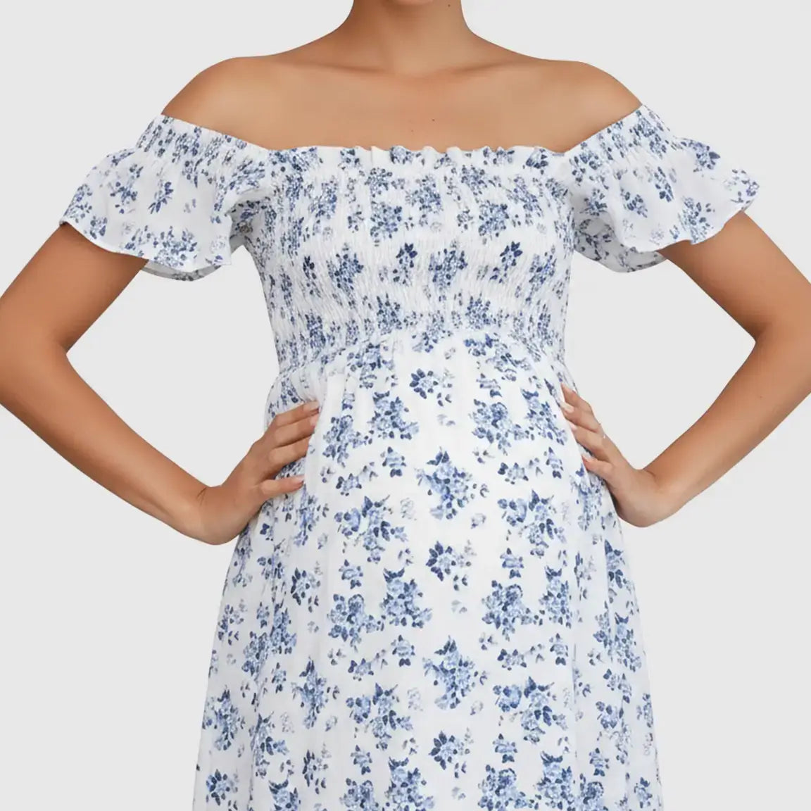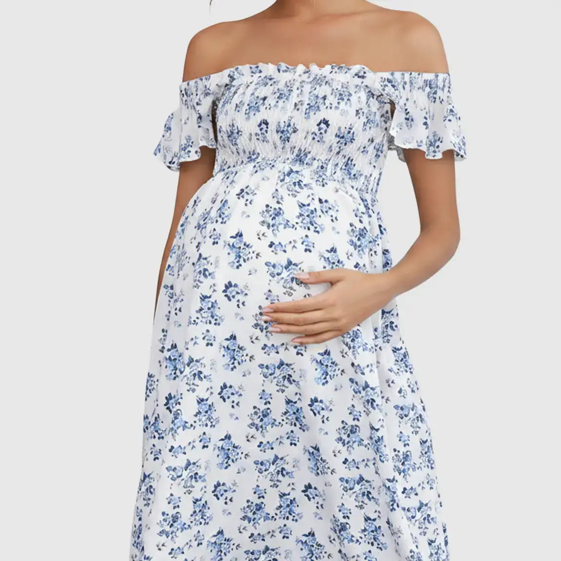 This Smocked Bodice Maternity Dress features a stretchy smocked top, a romantic off-shoulder neckline, and a soft floral print made for warm sunny days. The flowing A-line skirt drapes beautifully, giving you comfort, breathability, and feminine flair in one easy piece.