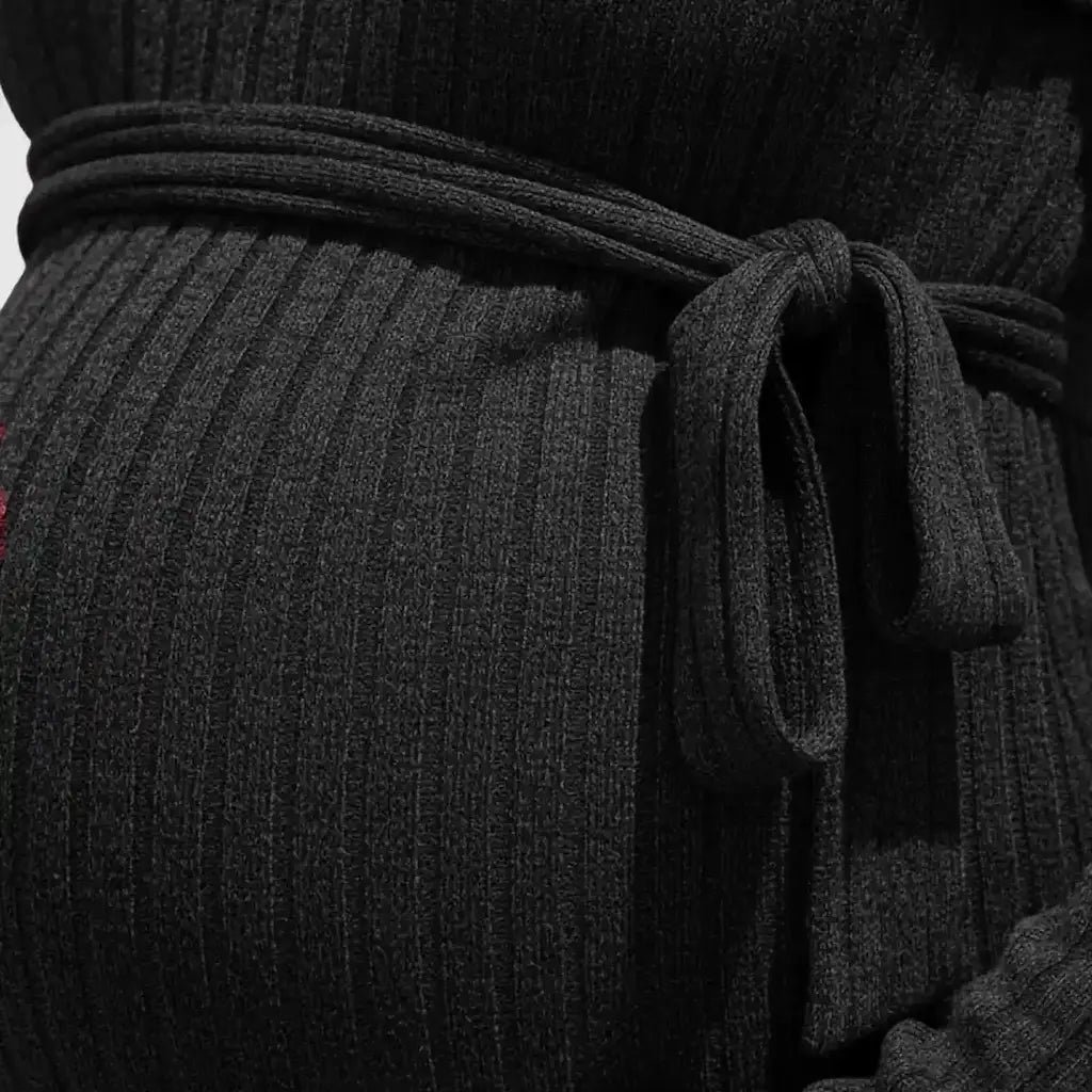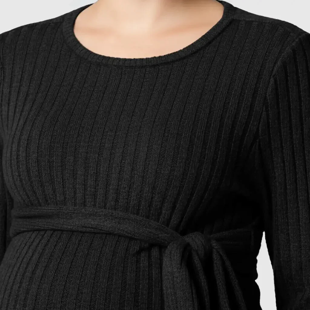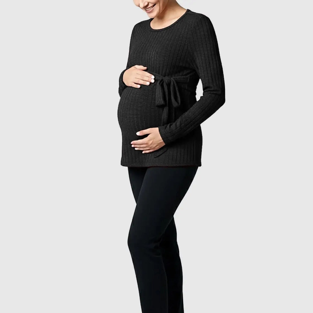 Meet your new everyday maternity essential: a soft, stretchy ribbed knit top designed to flatter your changing shape from the first trimester to postpartum. The adjustable tie-waist gives you a customized fit at every stage, while the cozy long sleeves and textured knit make it perfect for autumn and winter. Whether you're out running errands or relaxing at home, this top keeps you feeling supported, warm, and effortlessly put-together.
