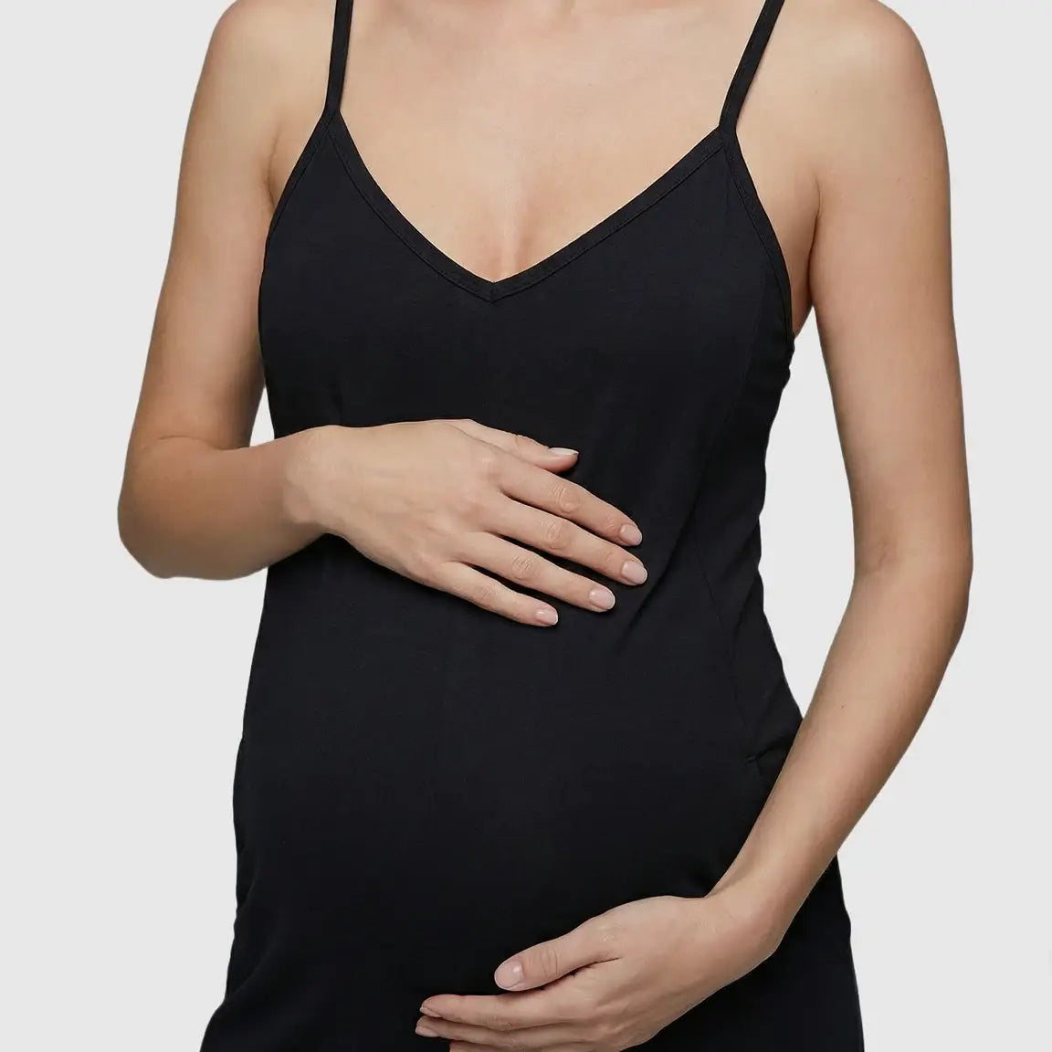 This soft, stretchy, everyday one-piece moves with your changing body, giving you room to grow without losing the sleek, flattering shape you love. With supportive spaghetti straps, a breathable slim-fit design, and flexible fabric that molds to your bump, it's made for life from pre-pregnancy through postpartum. Side pockets and a relaxed leg silhouette make it perfect for lounging, school runs, errands, or chasing toddlers with ease.