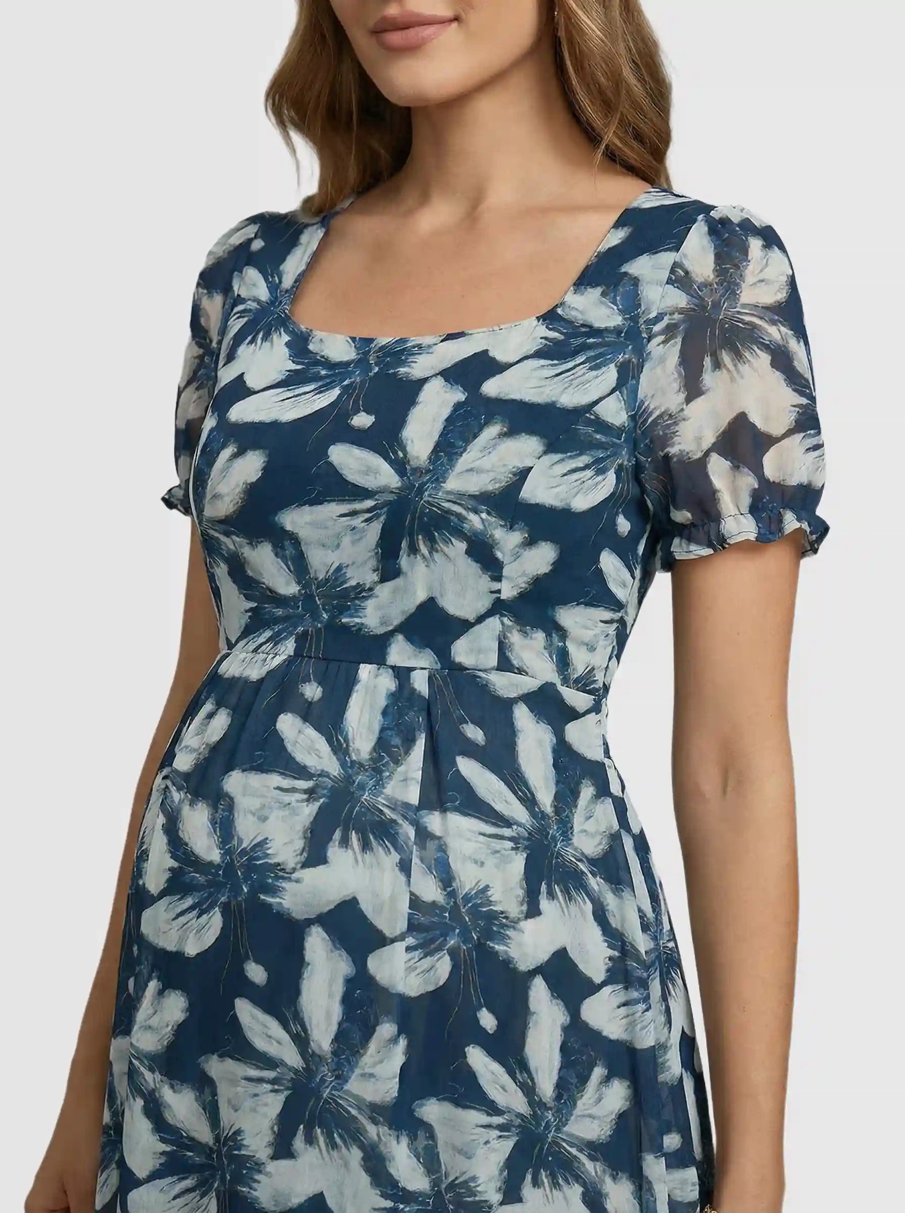 Square Neckline Floral Mid-Waist Cut Maternity Midi Dress