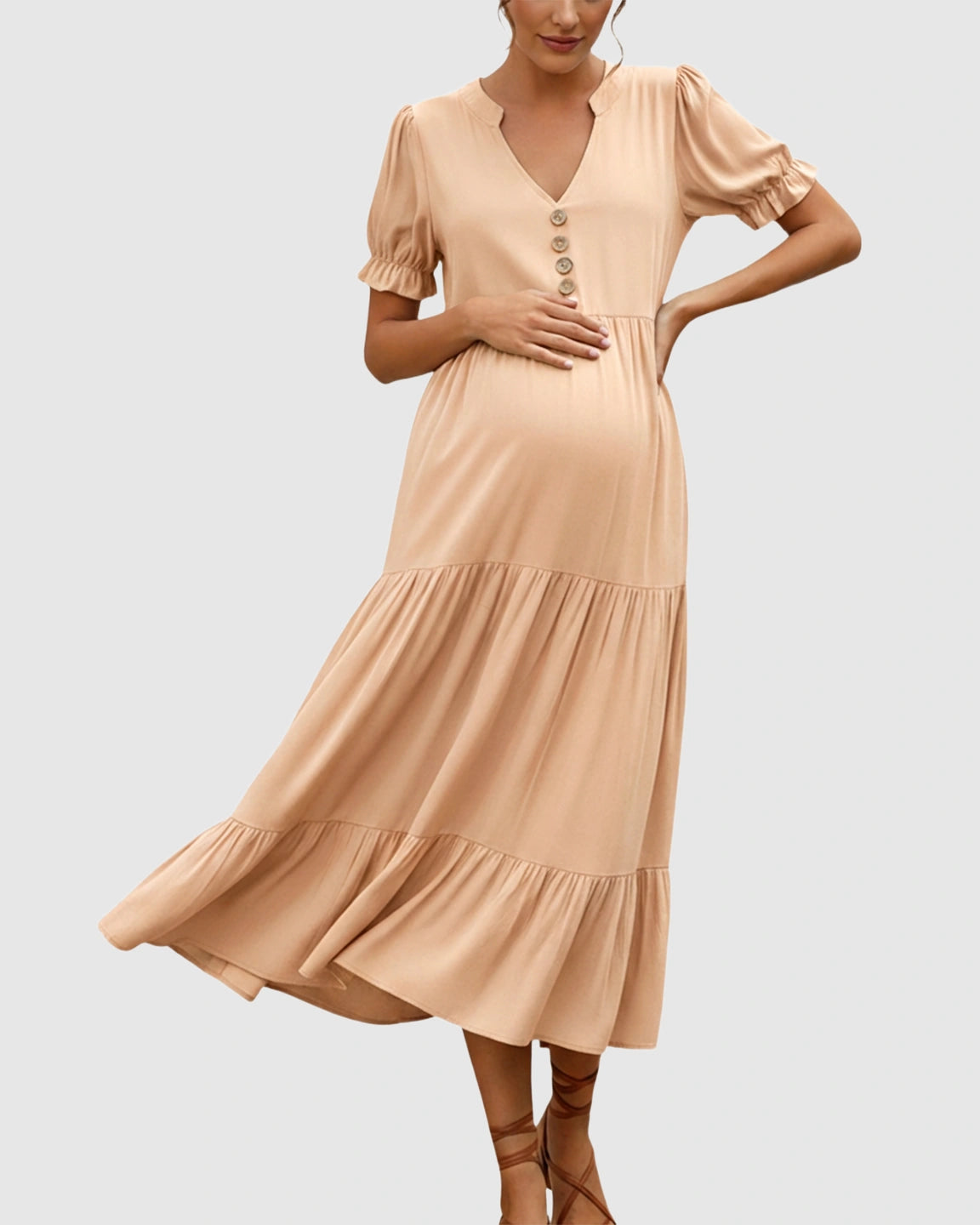 The Stand-up Collar Tiered Skirt Maternity Midi Dress blends commute style with comfort for all-day wear. Soft, breathable viscose fabric drapes beautifully over your bump, while the high-waisted A-line skirt and ruffle splicing add a flattering, feminine silhouette. The stand-up collar and short sleeves give a polished, elegant vibe, perfect for work, light social events, or casual outings.