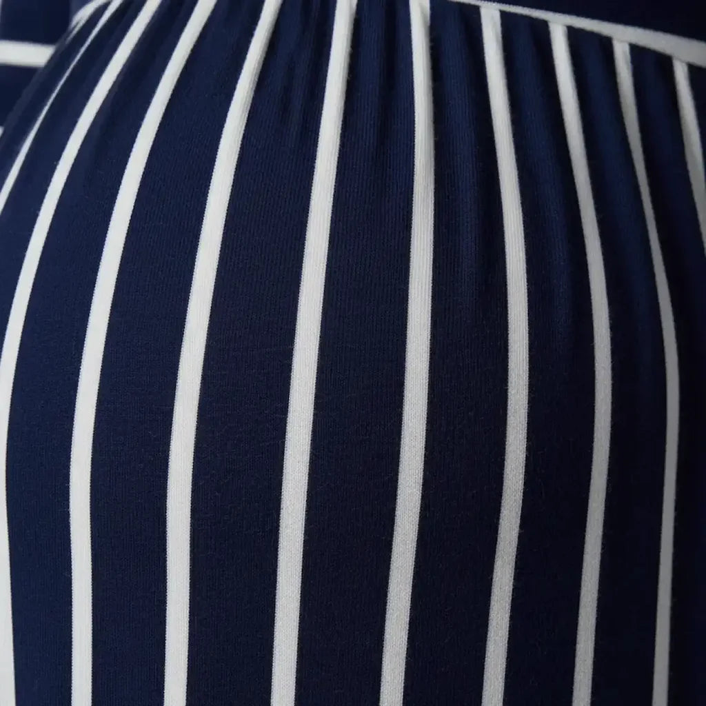 This floor-length maternity maxi dress blends comfort and style with soft stretch fabric that adapts beautifully to your growing bump. Designed with long sleeves and a classic striped pattern, it offers the perfect balance of casual elegance — ideal for spring and autumn days, cozy evenings, or even your maternity photoshoot and baby shower. The graceful gown-inspired silhouette flows naturally for a flattering look that makes you feel confident, comfortable, and ready for every special moment.