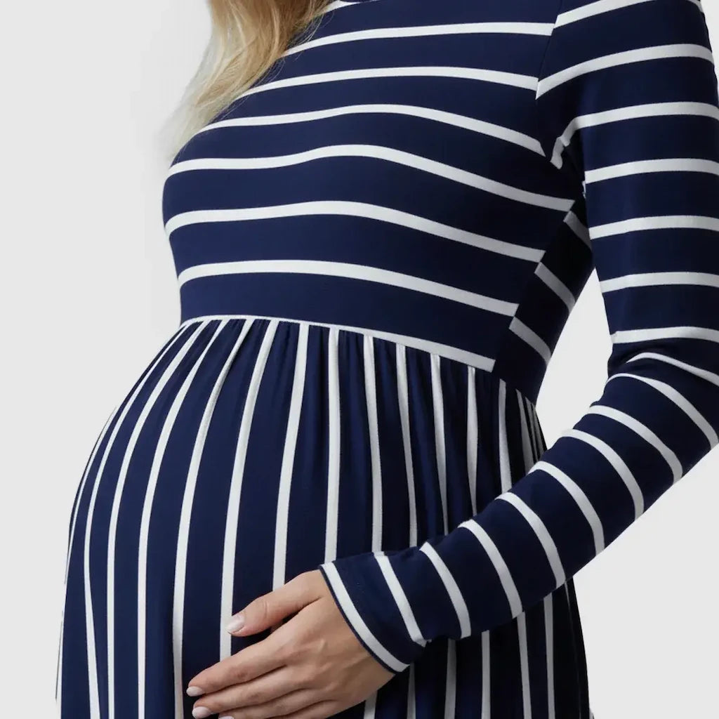 Graceful stripes and a flowing silhouette create a timeless, elevated look that flatters every trimester.