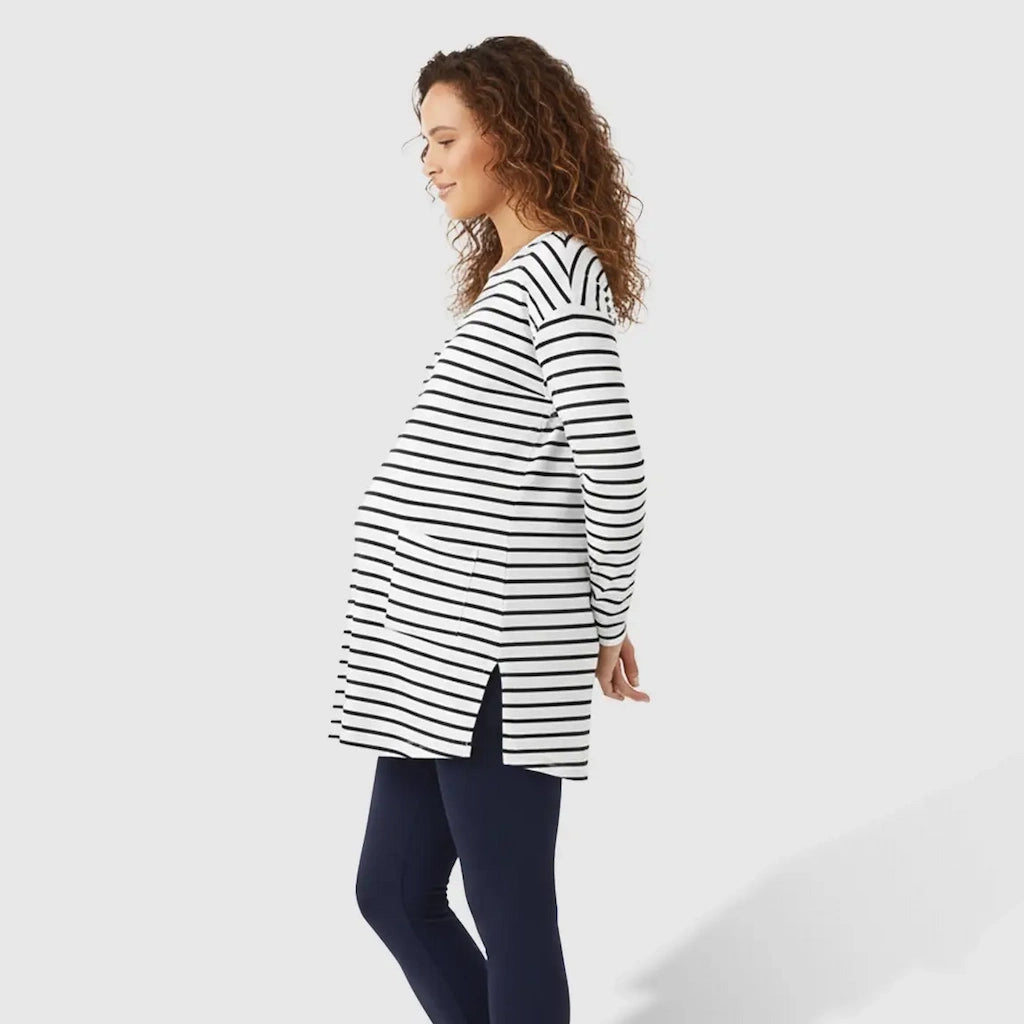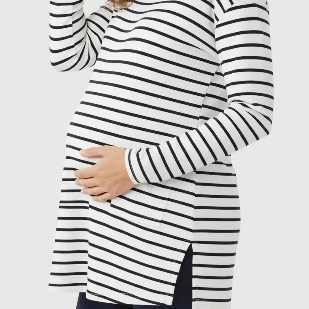 Striped Round Neck Long Sleeve Maternity Top with Pockets