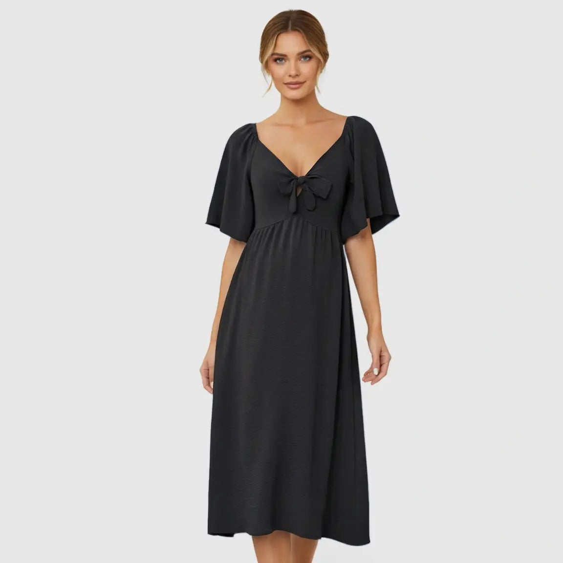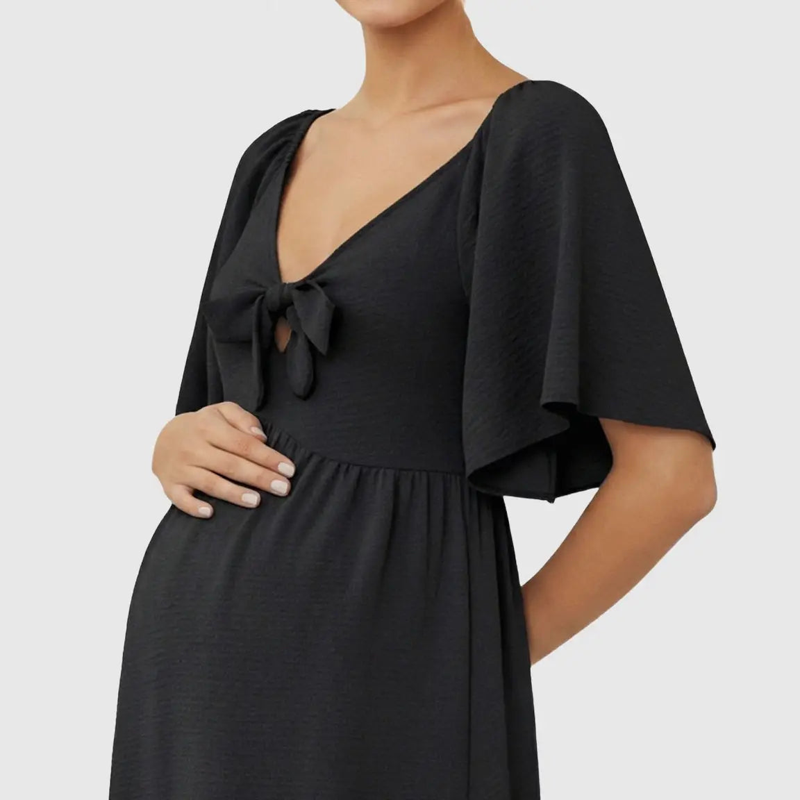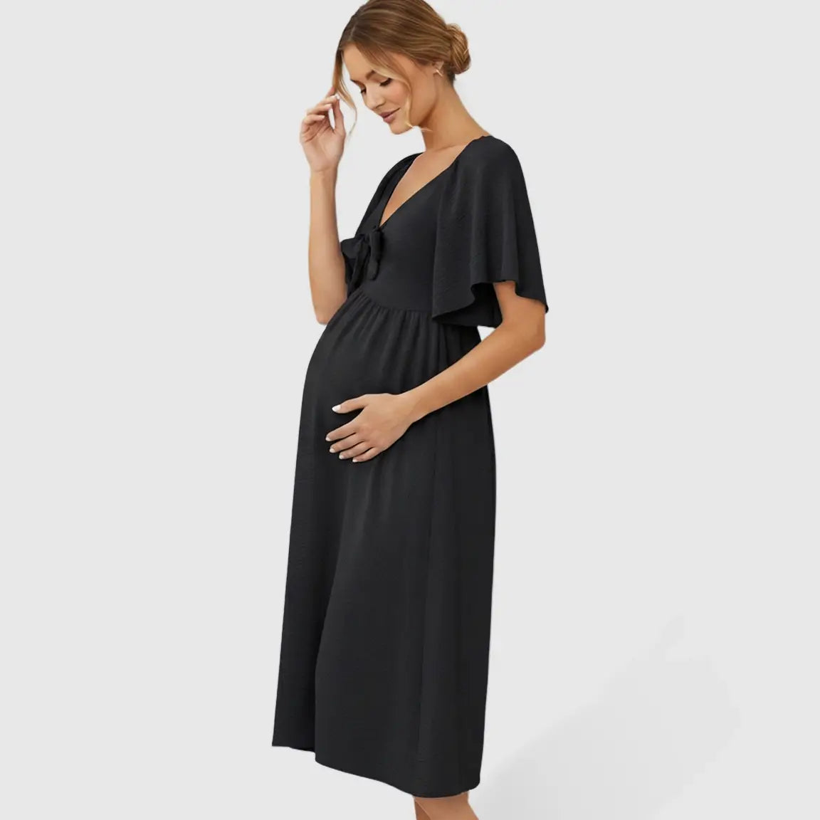 This Tie-Knot Front Maternity Midi Dress is crafted from soft, breathable polyester-spandex fabric that drapes beautifully over your bump without clinging. The deep V-neckline, feminine butterfly sleeves, and flowy swing silhouette create a flattering, bump-friendly fit that keeps you comfortable from early pregnancy to your final trimester. With its effortless shape and lightweight feel, this is the dress you’ll reach for on busy mornings, casual days out, and everything in between.
