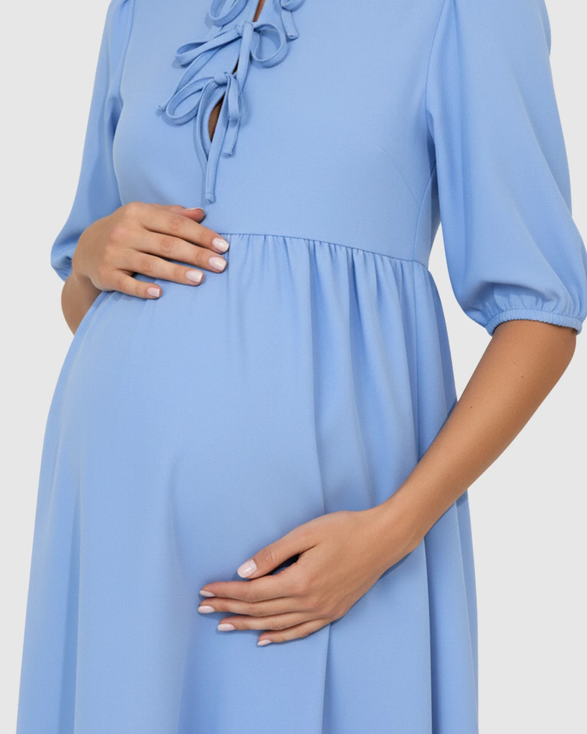 This chiffon maternity dress is lightweight, breathable, and moves with your changing tummy. The babydoll silhouette and loose fit keep you comfortable while highlighting your bump in a sweet, age-reducing way. The tie-neck lace-up detail lets you adjust the neckline for the perfect fit, and the short puff sleeves add a fresh, playful touch.