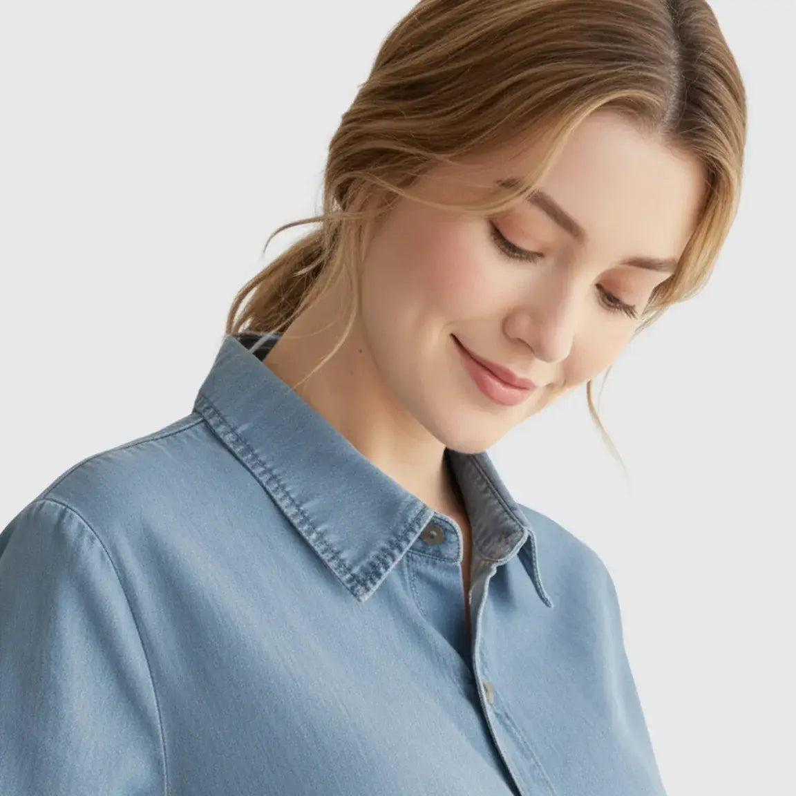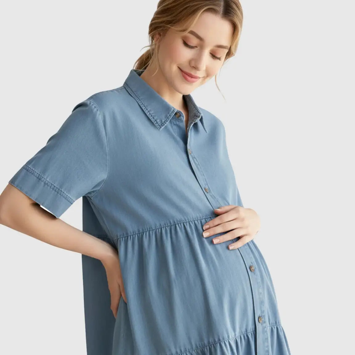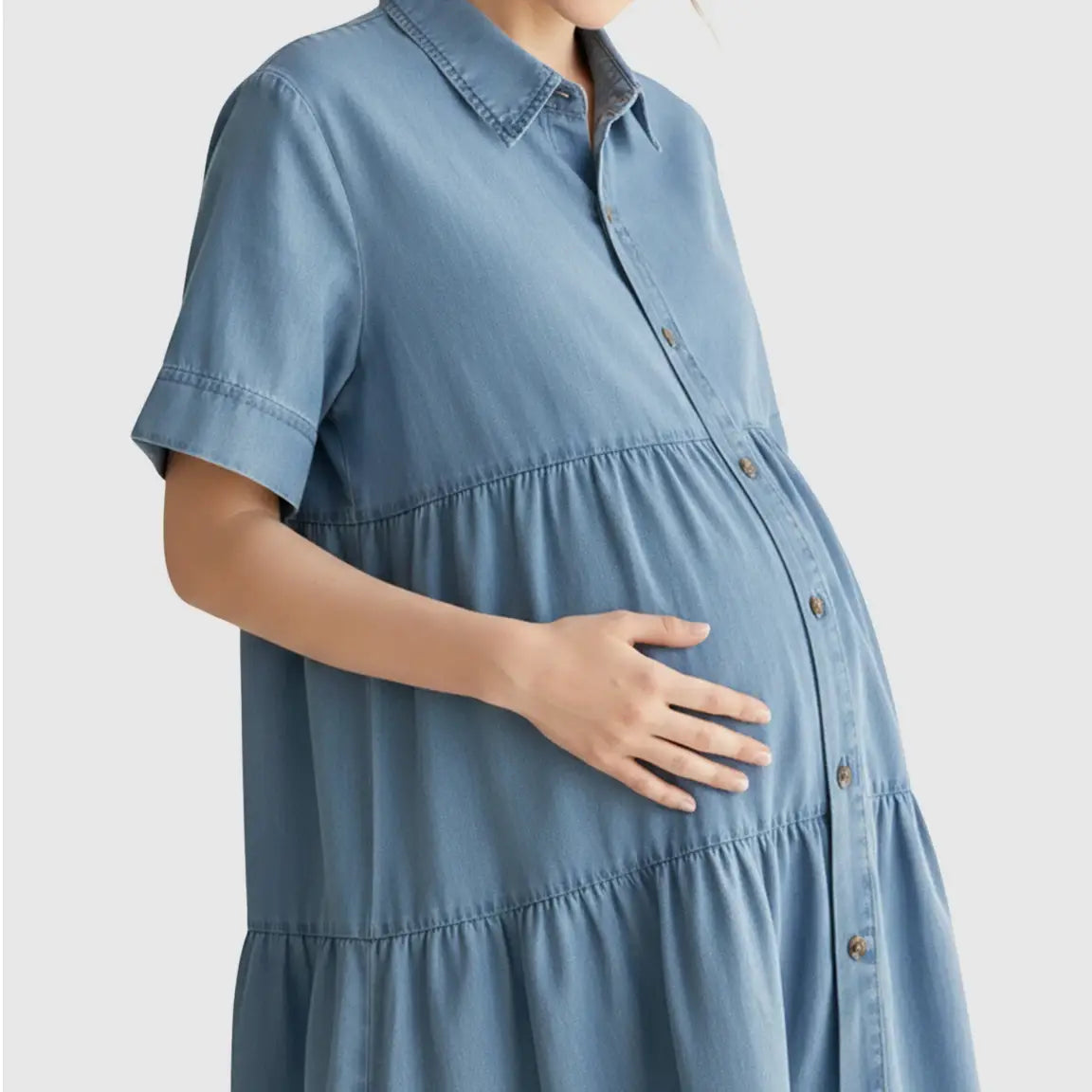 Meet your new go-to maternity denim dress, designed with a relaxed tiered silhouette that gives you space to breathe, move, and grow. The soft, lightweight denim blend drapes beautifully without feeling heavy, keeping you comfortable through long days, warm weather, and every trimester. With its button-front shirt style and easy midi length, it transitions seamlessly from pregnancy to postpartum, so you always feel put-together with zero effort.