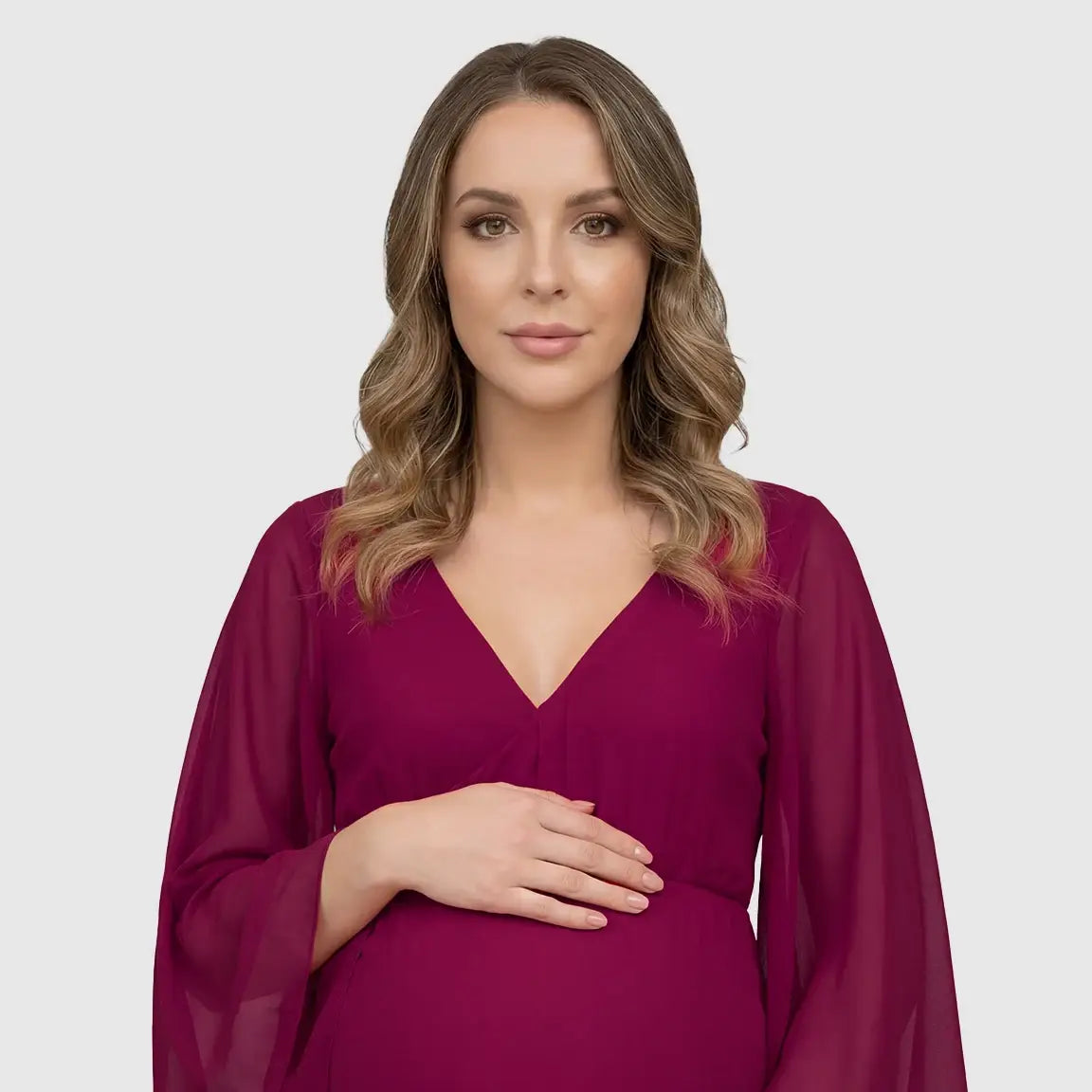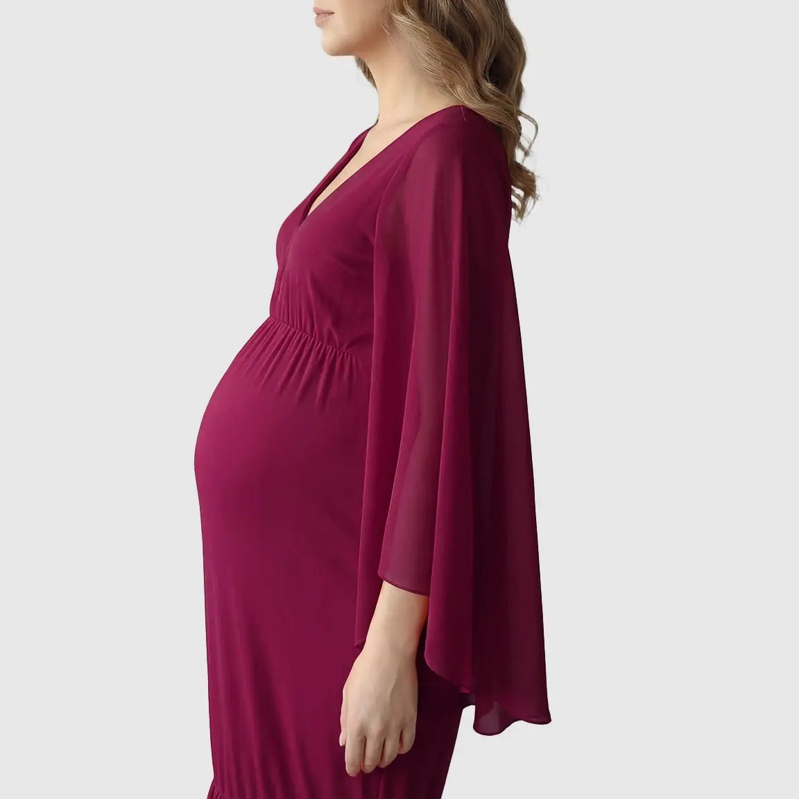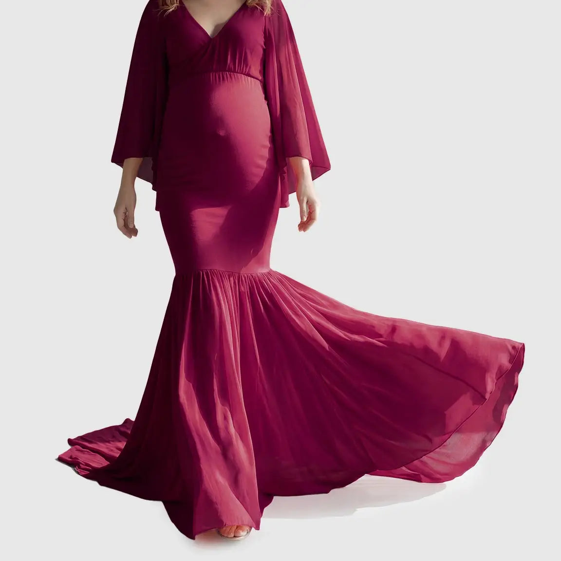 Designed for stunning maternity photoshoots, this flowing, soft pink gown drapes beautifully over your bump, giving you a dreamy, feminine silhouette. The deep V-neckline, long bell sleeves, and dramatic trailing hem create an ethereal look made for capturing once-in-a-lifetime moments. With stretchy, lightweight fabric that moves with you, it’s perfect for maternity photography and special occasions throughout pregnancy.