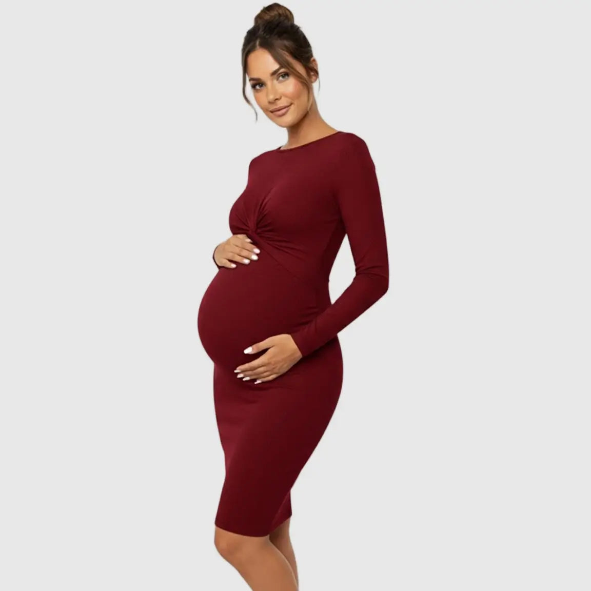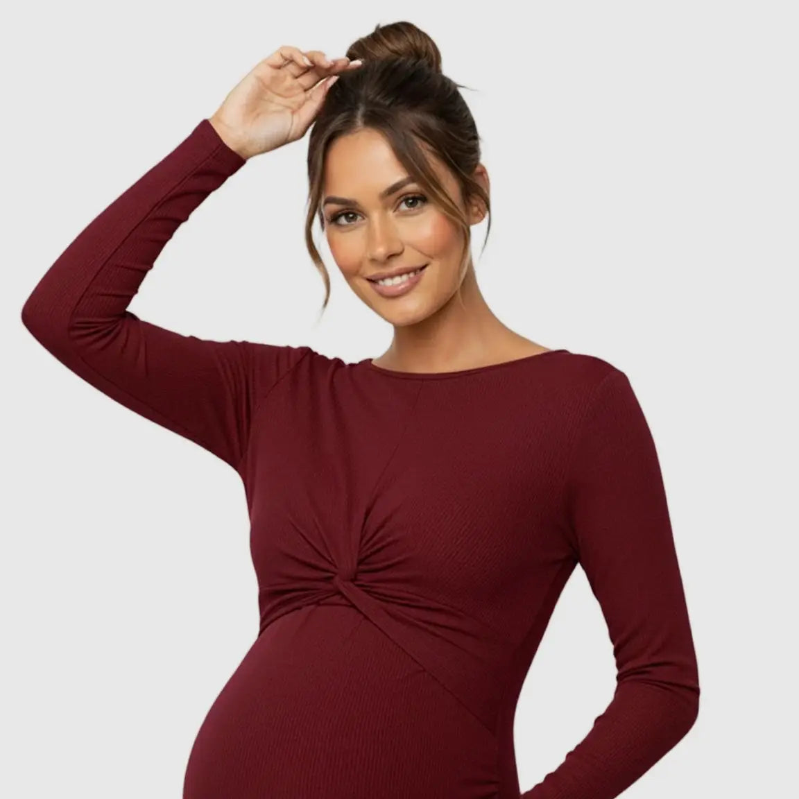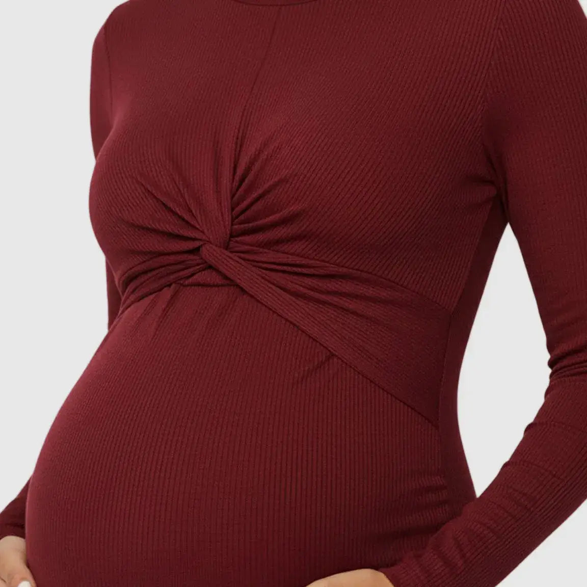 Effortlessly chic and designed to grow with you. This Twist Front Ribbed Maternity Dress is the ultimate glow-up for your maternity wardrobe. Crafted from a premium, ultra-stretchy ribbed knit, it features a sophisticated twist-front detail and a flattering empire waist. Whether for a baby shower or a photoshoot, this bodycon silhouette highlights your bump while keeping you comfortable from your first trimester to your last.