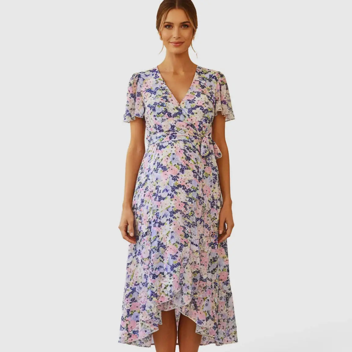 V-Neck Wrap-Style Floral Maternity Midi Dress