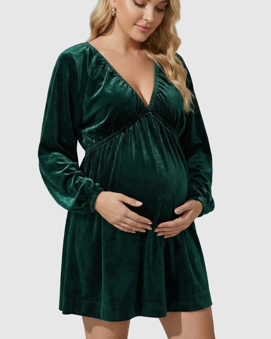 This trendy Vneck velvet babydoll mini dress flows over your bump with a flattering high waist and soft lantern sleeves that move with you, not against you.