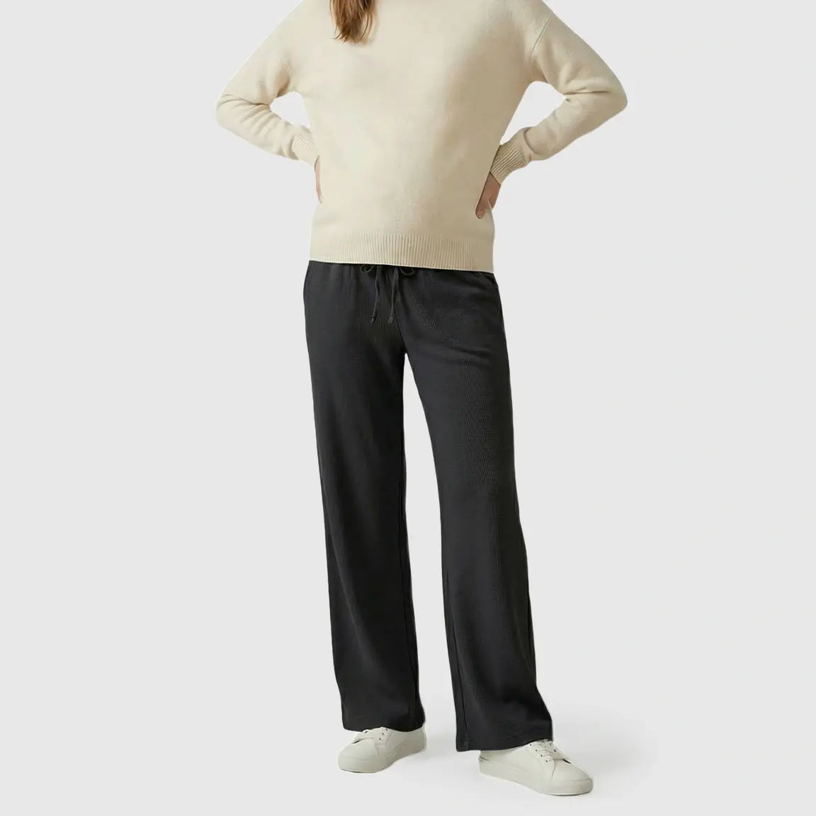 These Waffle Knit Wide-Leg Maternity Trousers bring effortless comfort with a breathable, cotton-rich waffle texture and a relaxed silhouette that feels good all day. The stretchy waistband adapts gently to your changing body while the wide-leg design gives you that easy, flowy fit moms love. Wear them from pre-pregnancy through postpartum for lounging, errands, or everyday comfort, no restriction, just freedom.