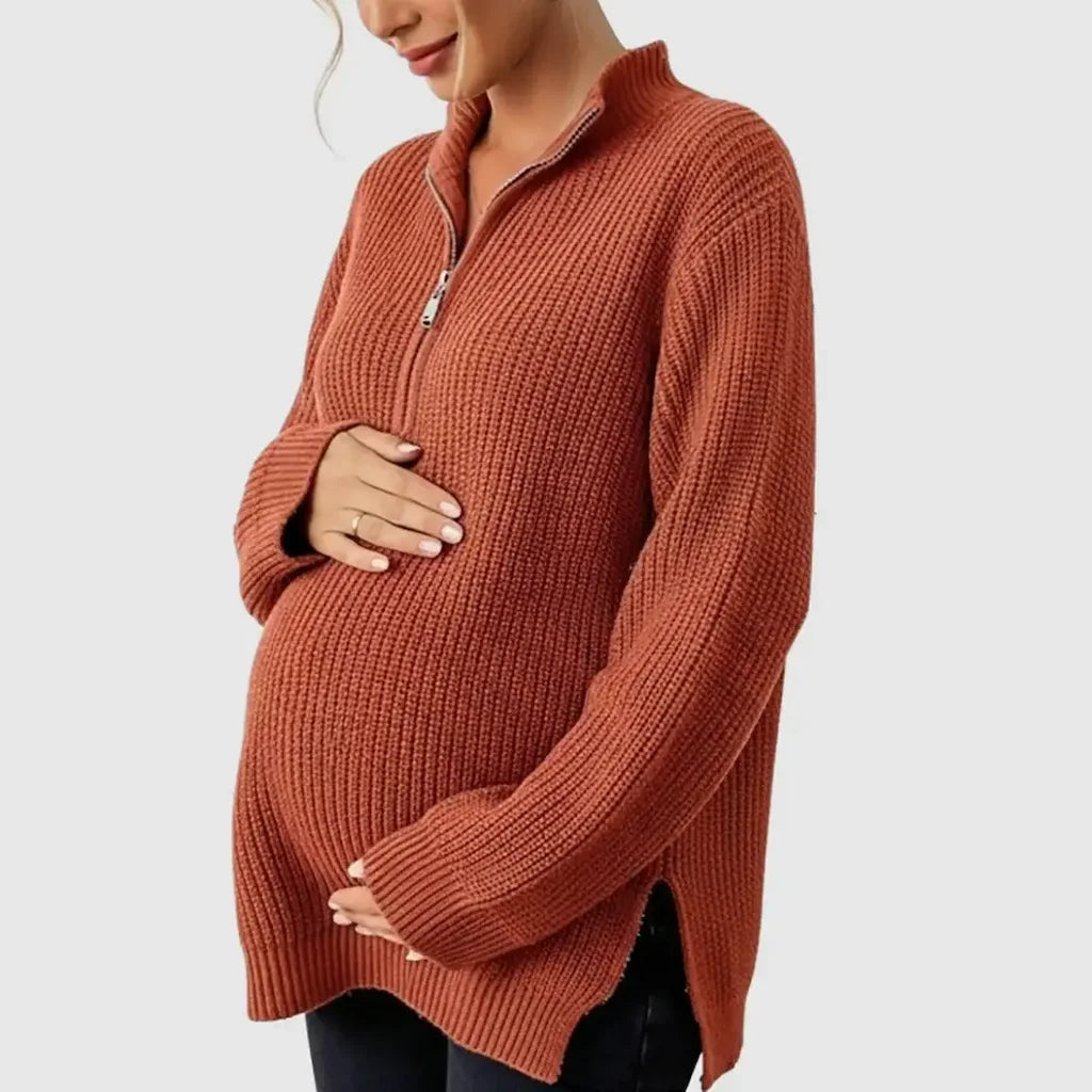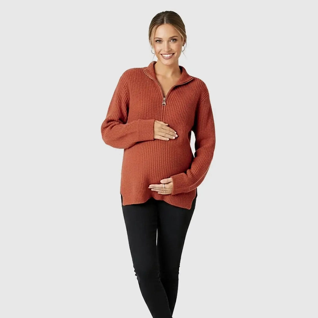 The Ribbed Knit Half-Zip Maternity Sweater wraps you in soft, breathable warmth through every stage — from early pregnancy to postpartum mornings at home. Its flexible ribbed texture moves with your changing body, while the half-zip neckline lets you adjust from relaxed to refined in seconds. Effortless to style, endlessly comfortable, and designed to flatter your shape before, during, and after baby.